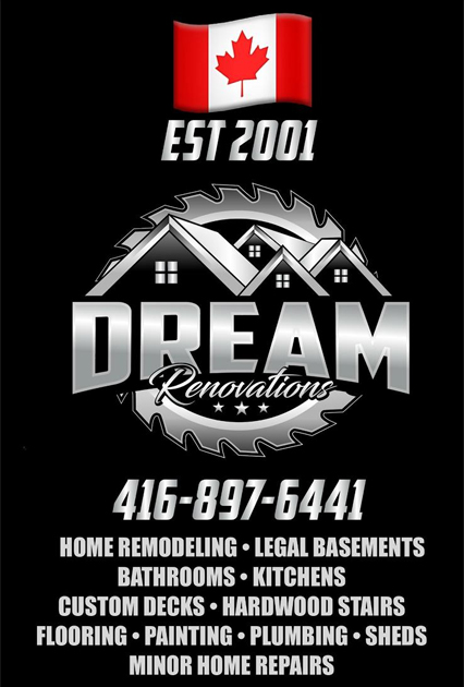 Dream Renovations has been serving the GTA since 2001 and has the experience to bring your dreams to life. We do everything from complete basements, bathrooms, kithchens, decks, sheds, exterior house repairs to hardwood stairs, flooring, painting, LED pot lights and plumbing. Contact us for free estimate 416-897-6441